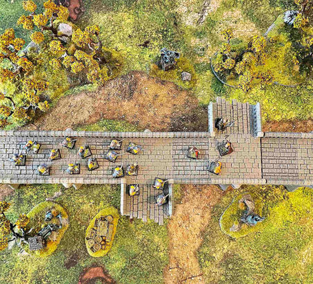 Table de jeu personnelle réalisée en impressions à la demande avec des modèles en provenance de différents concepteurs. Les tours et barricades bois proviennent de chez Infinite Dimensions Games, la petite forge est le modèle SMITHY de la gamme LEICHHEIM (au catalogue)